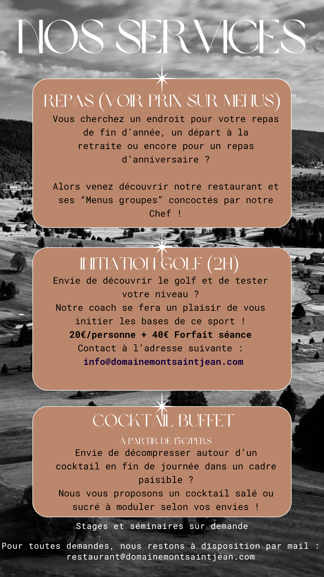 Que vous soyez une entreprise ou un particulier, venez profitez de notre golf et de notre restaurant grâce à nos différents services qui se modulent et s'ajustent selon vos envies.